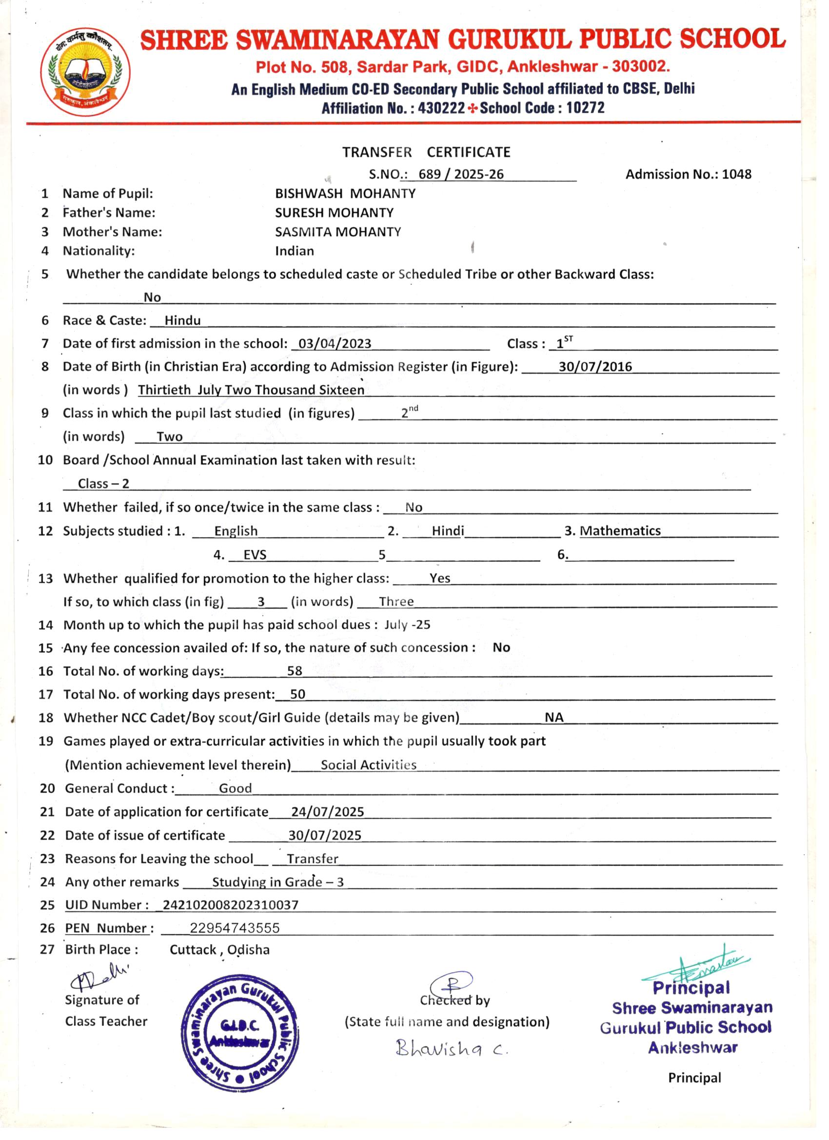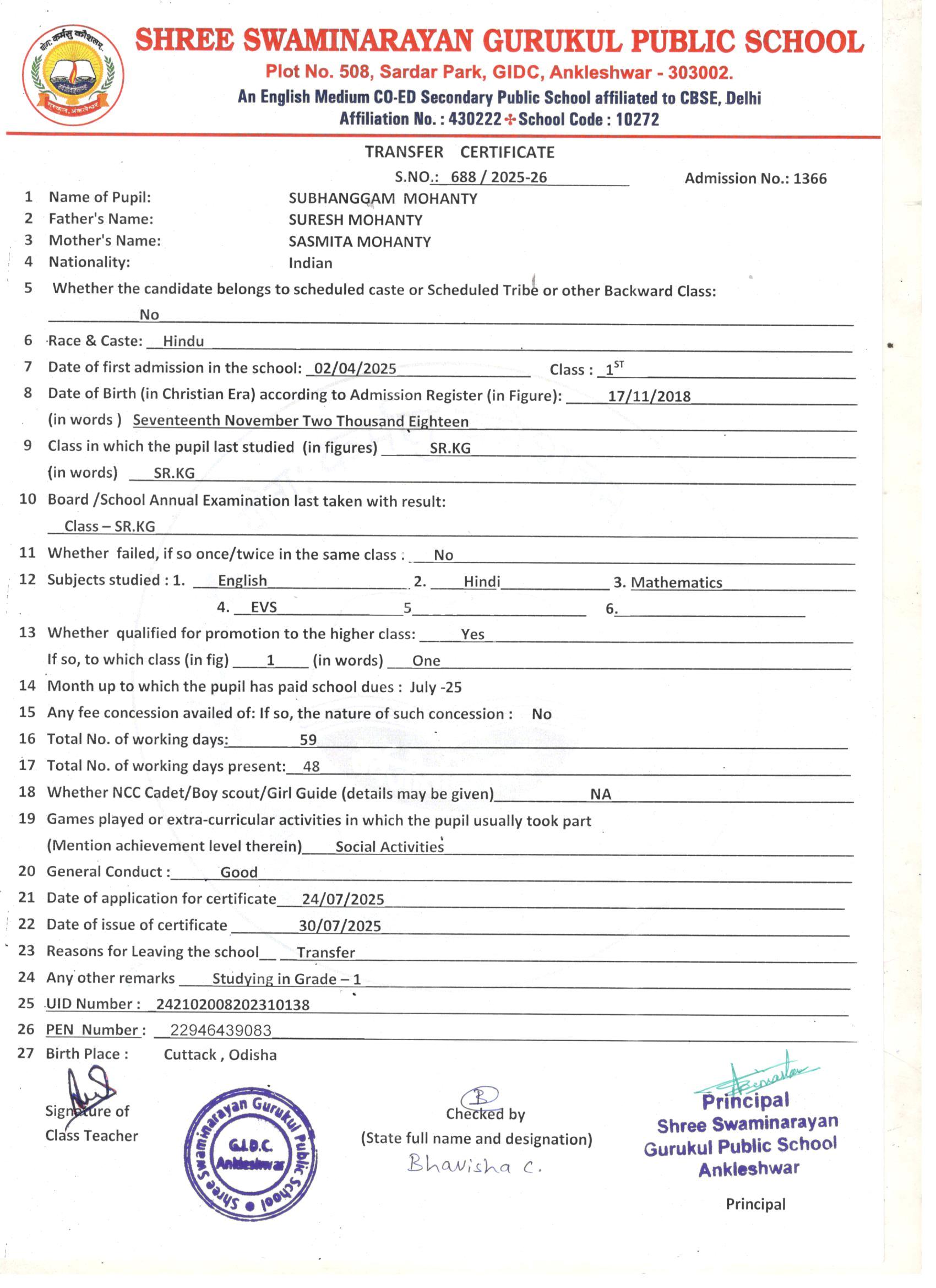 621 SUBHANGGAM MOHANTY SURESH MOHANTY 17/11/2018 1366 SR.KG. 688 30/07/2025 STUDYING IN GRADE-1ST