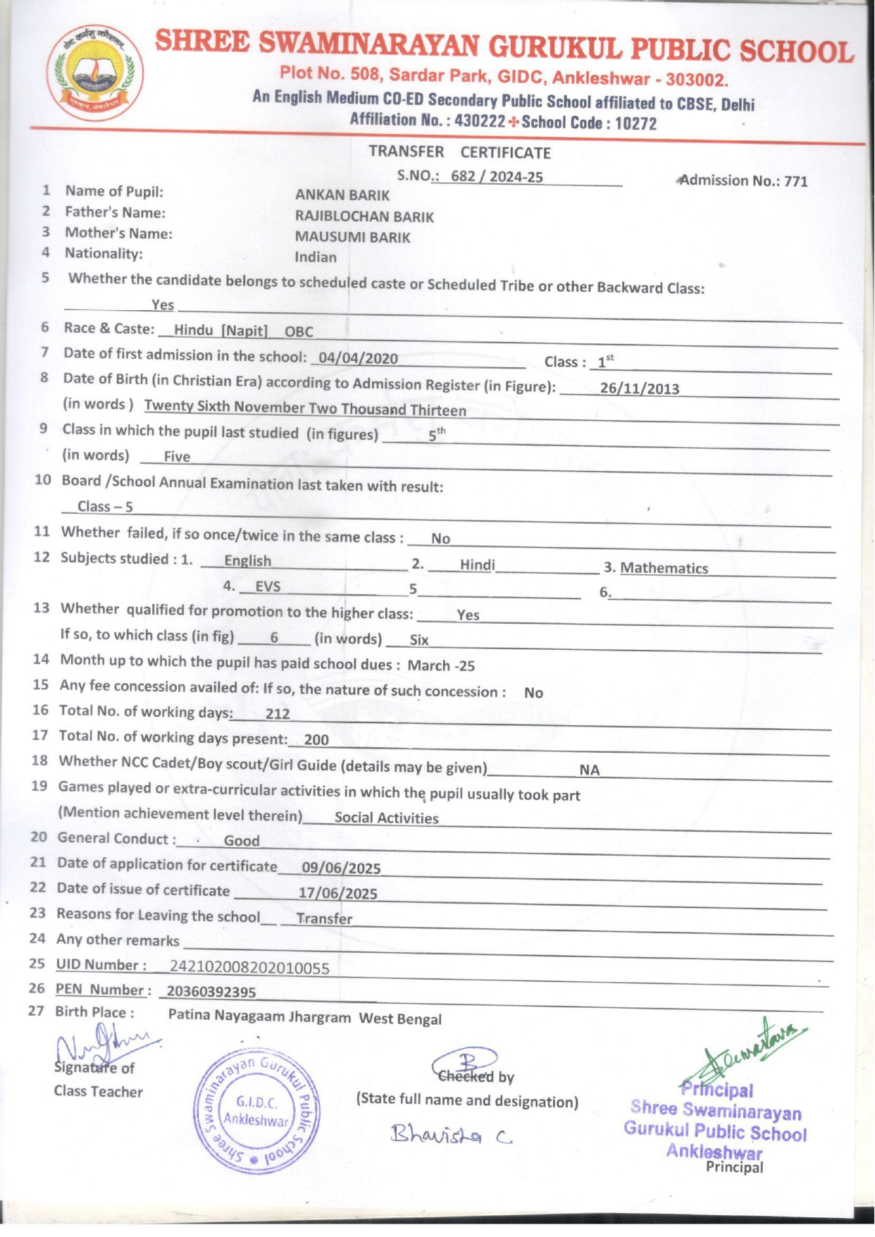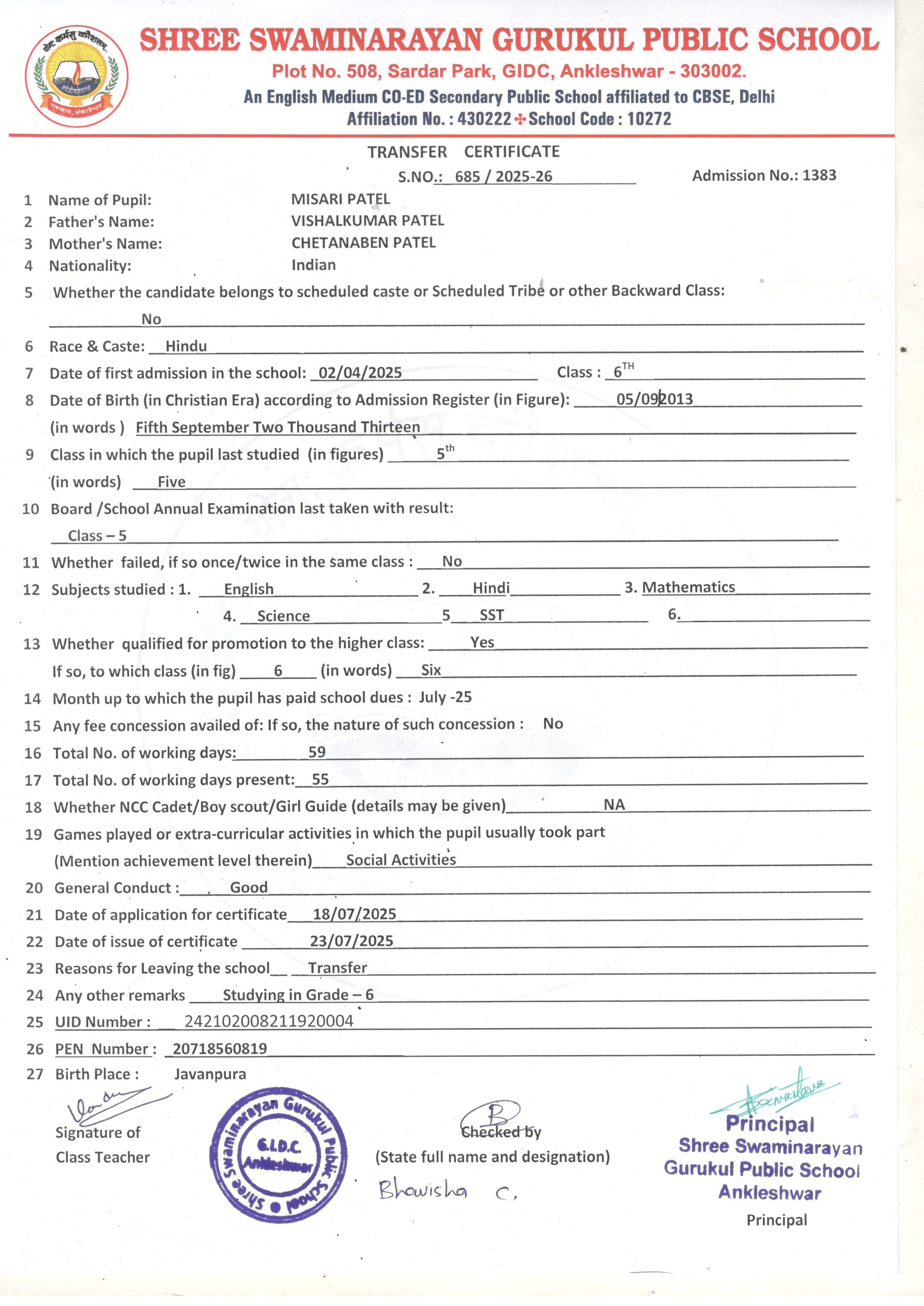 618 MISARI PATEL VISHALKUMAR PATEL 05/09/2013 1383 5TH 685 23/07/2025 STUDYING IN GRADE-6TH