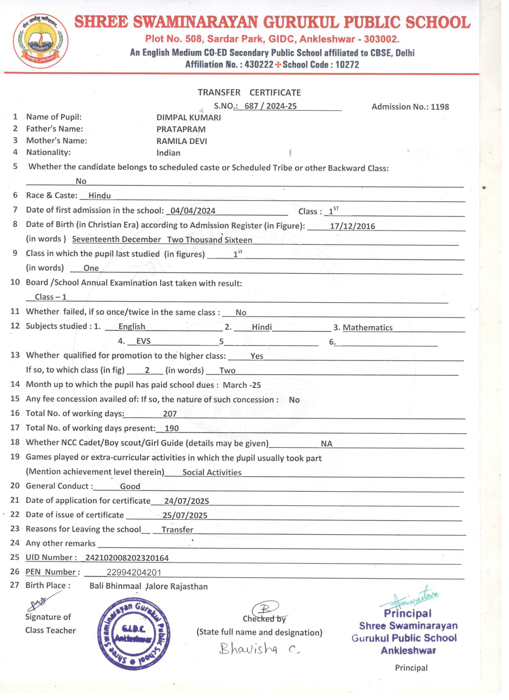 620 DIMPAL KUMARI PRATAPRAM 17/12/2016 1198 1ST 687 25/07/2025 PASSED & PROMOTED TO CLASS 2ND