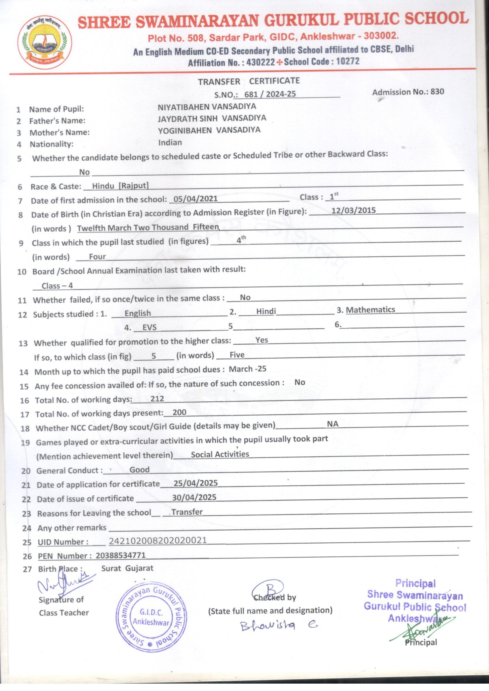 614 NIYATIBAHEN VANSADIYA JAYDRATH SINH VANSADIYA 12/03/2015 830 4th 681 30/04/2025 PASSED & PROMOTED TO CLASS 5th
