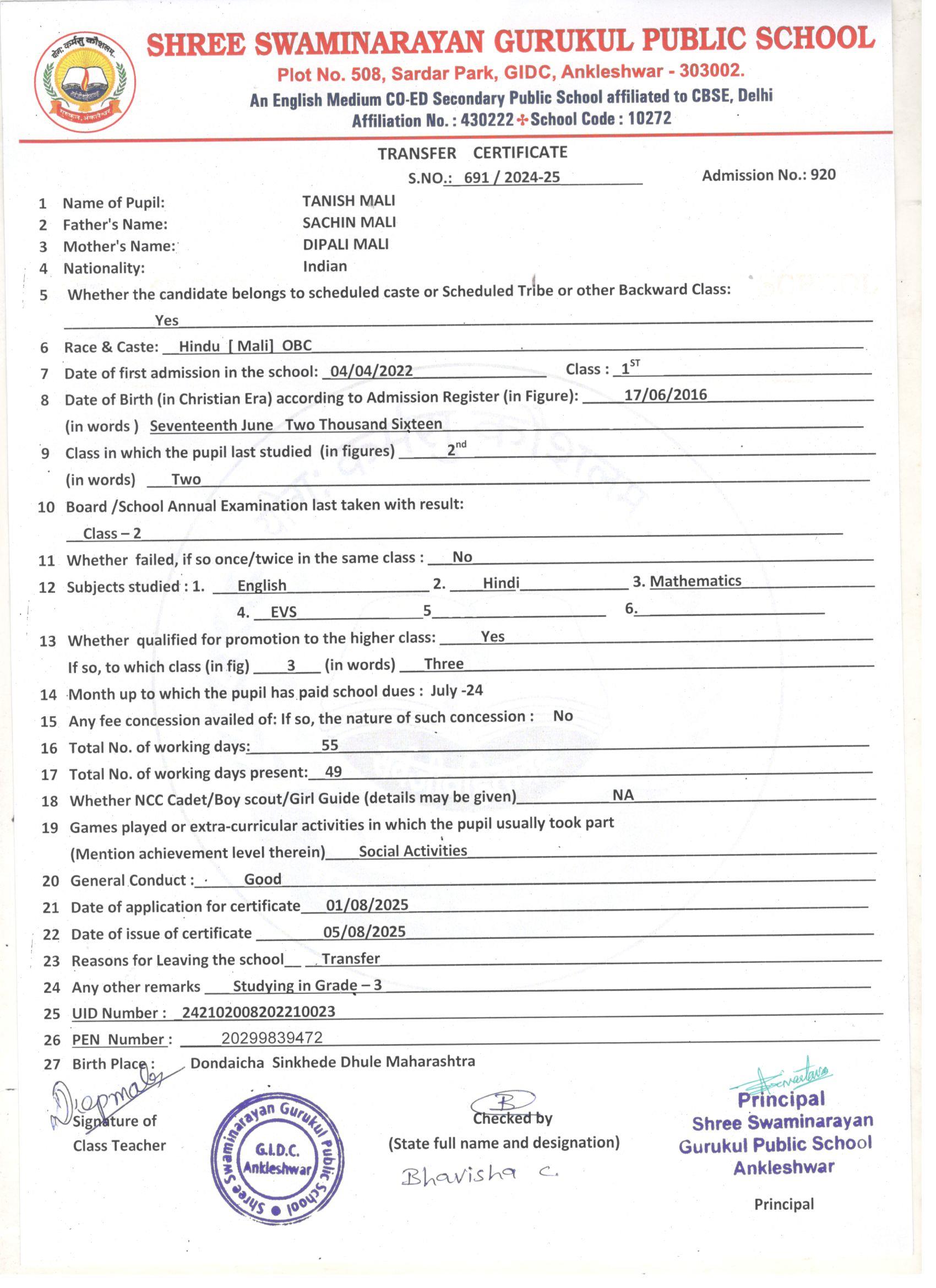624 TANISH MALI SACHIN MALI 17/06/2016 920 2nd 691 05/08/2025 STUDYING IN GRADE-3RD
