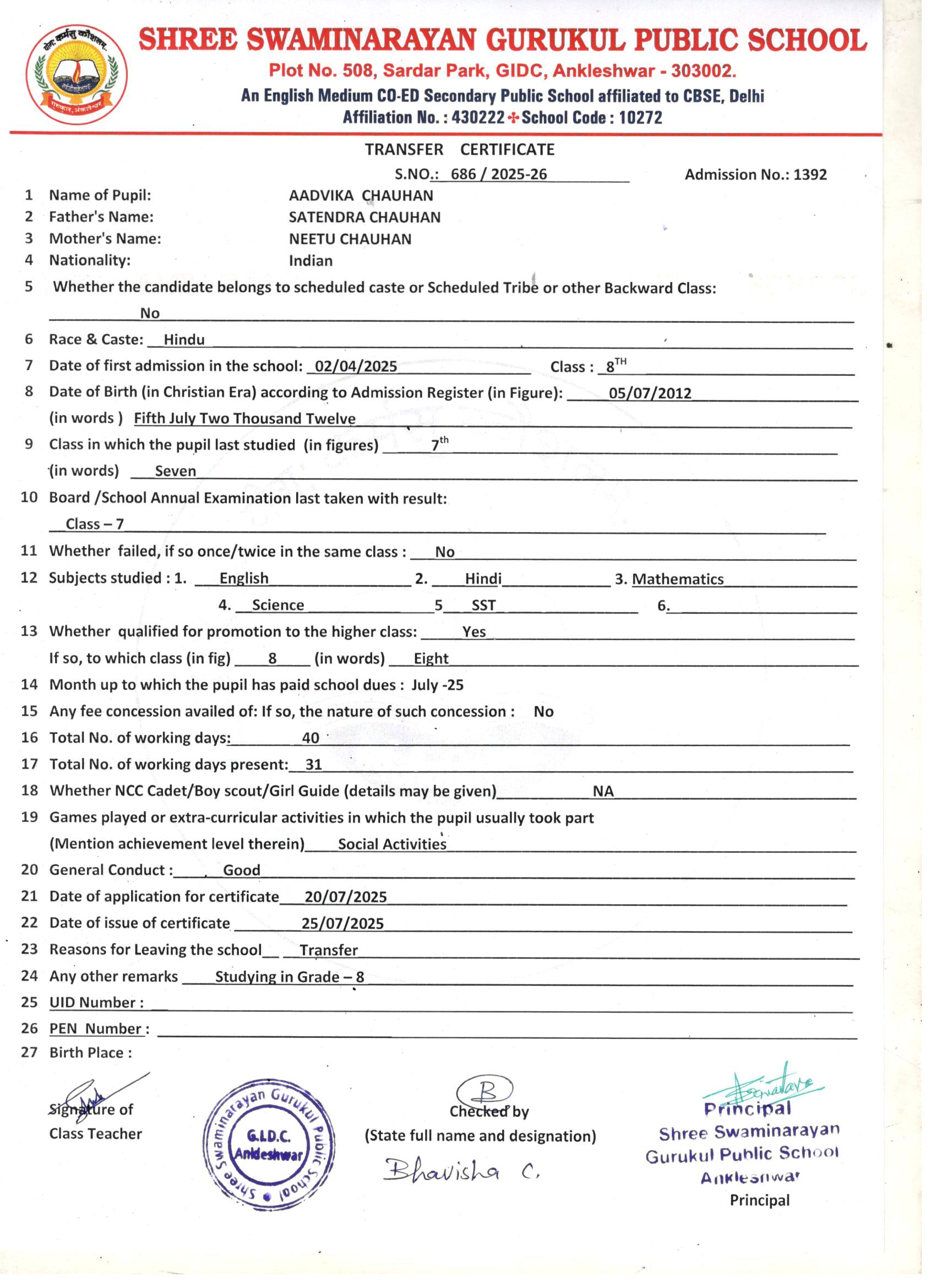 619 AADVIKA CHAUHAN SATENDRA CHAUHAN 05/07/2012 1392 7TH 686 25/07/2025 STUDYING IN GRADE-8TH