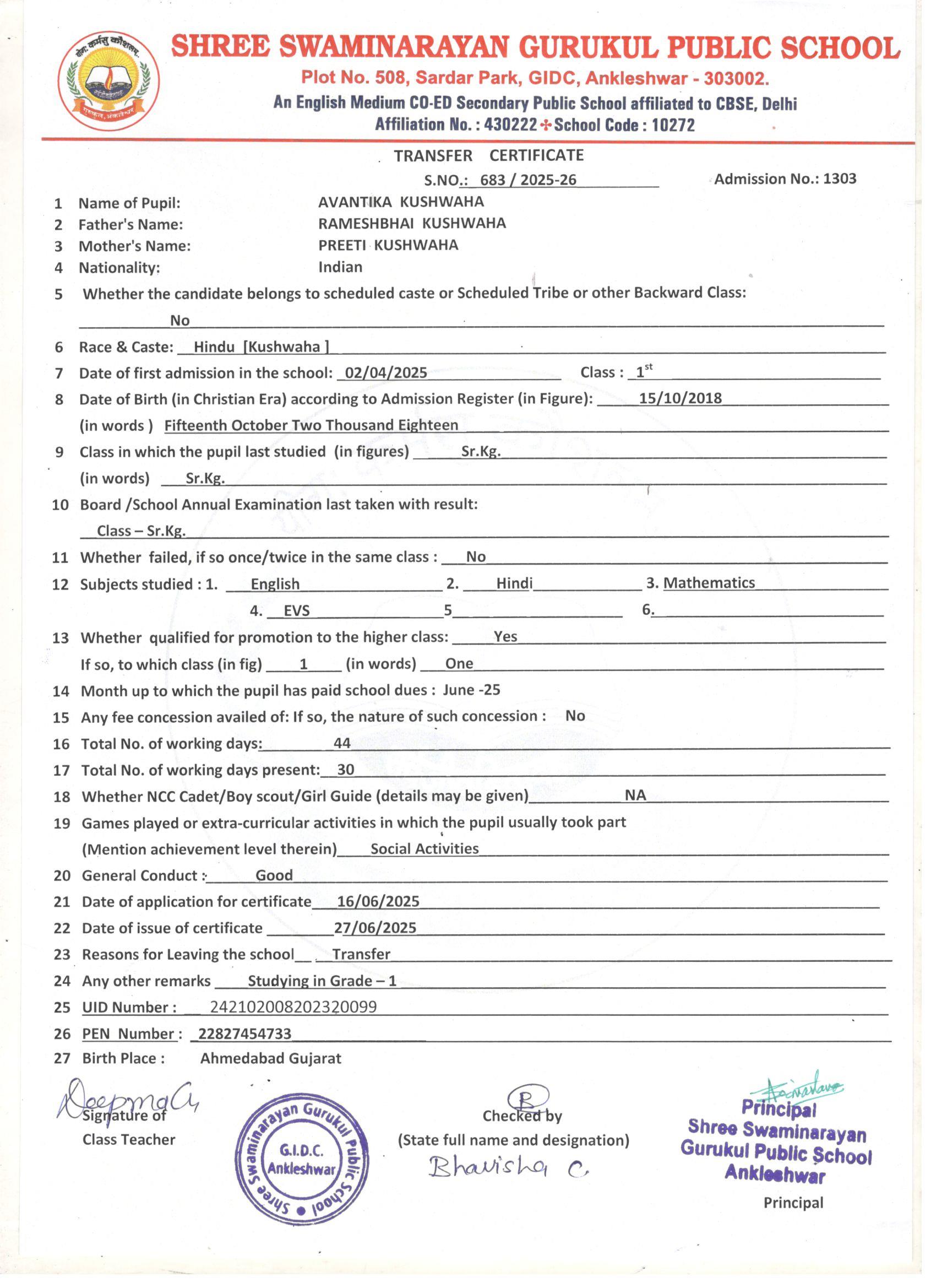 616 AVANTIKA KUSHWAHA RAMESHBHAI KUSHWAHA 15/10/2018 1303 SR.KG. 683 27/06/2025 STUDYING IN GRADE-1ST