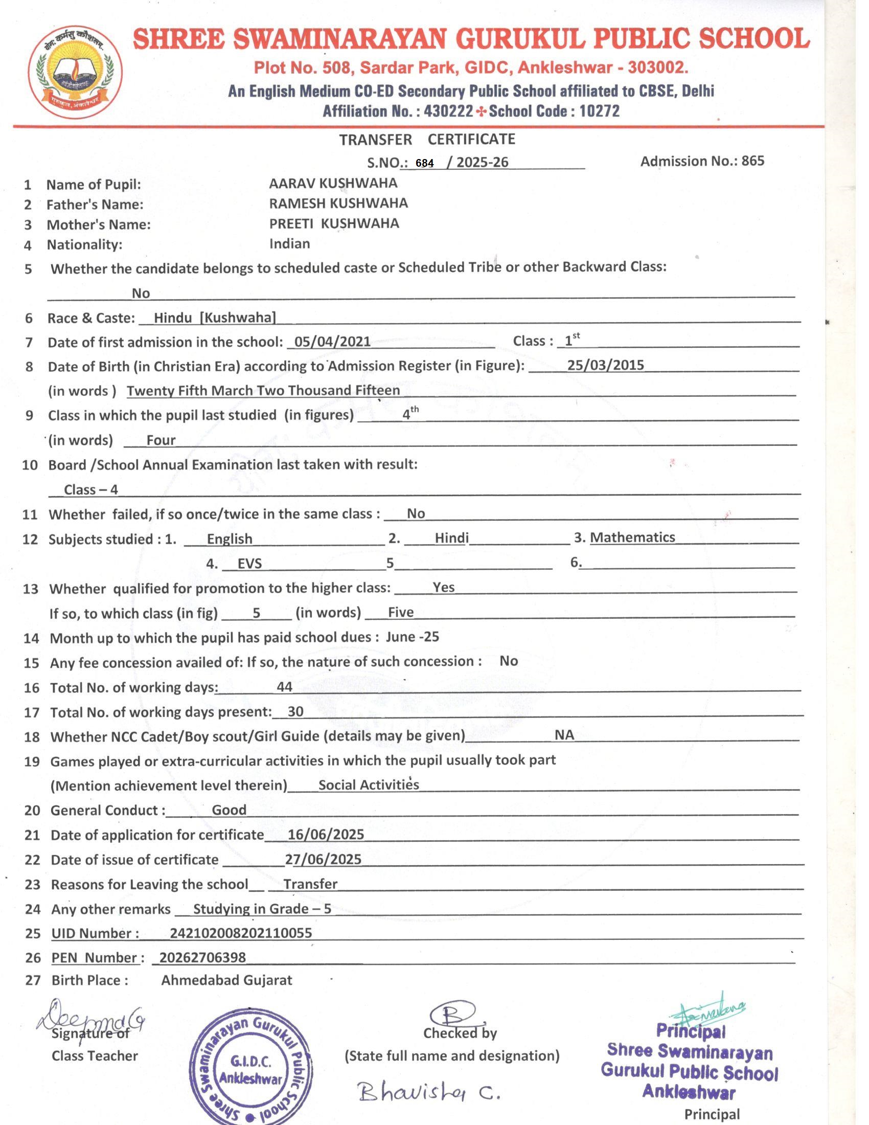 617 AARAV KUSHWAHA RAMESH KUSHWAHA 25/03/2015 865 4th 684 27/06/2025 STUDYING IN GRADE-5TH